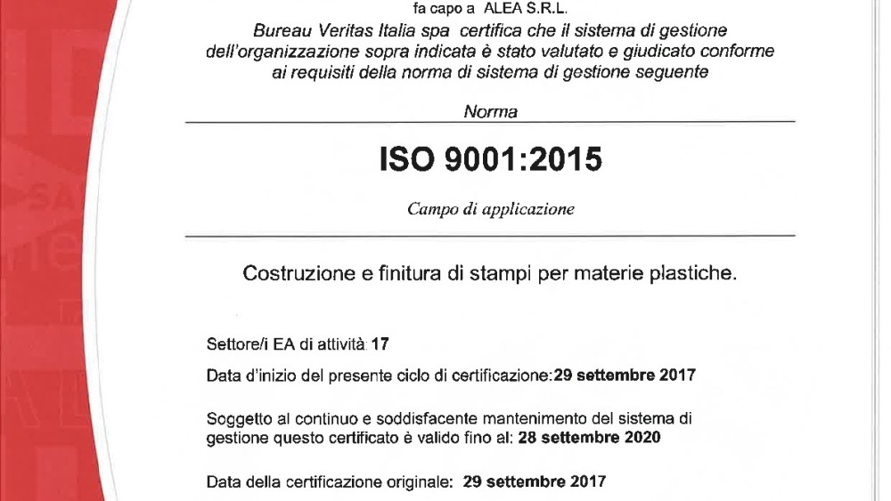 Questa certificazione garantisce e accerta il rispetto dei parametri standard 2015 per quanto riguarda la qualità, specificati e definiti dalla certificazione ISO 9001:2015. Un altro obbiettivo raggiunto dal nostro network in continuo sviluppo, che riconosce le nostre capacità e la nostra precisione in tutti i processi e le procedure svolte: dalla progettazione allo stampo finito, per quanto riguarda ZANOLA; dalla produzione e campionatura fino alla consegna del prodotto stampato finito, per quanto riguarda ALEA.